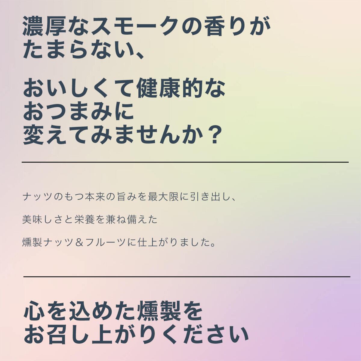 燻製は、低温で長時間燻煙をかけています(冷燻法)ナッツ本来の旨みと豊かな香ばしさを引き出します。