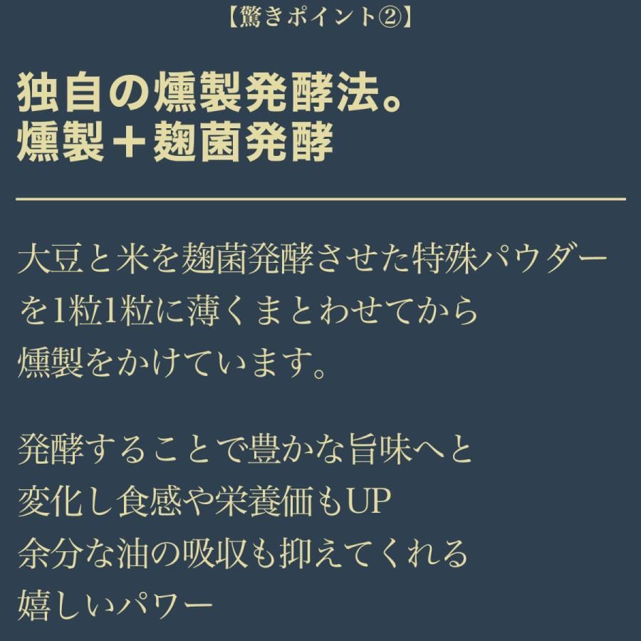 独自の燻製発酵法。 秘密は、燻製+麹菌発酵!! 大豆と米を麹菌発酵させた特殊パウダーを一粒一粒に薄くまとわせてから燻製をかけています。