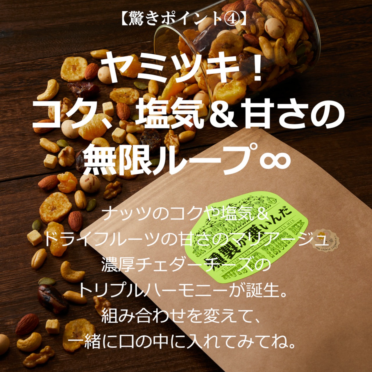 濃厚チェダーチーズの口どけ&ナッツのコク塩気&ドライフルーツの甘さ