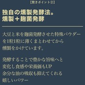 独自の燻製発酵法。秘密は、燻製+麹菌発酵!!大豆と米を麹菌発酵させた特殊パウダーを一粒一粒に薄くまとわせてから燻製をかけています。
