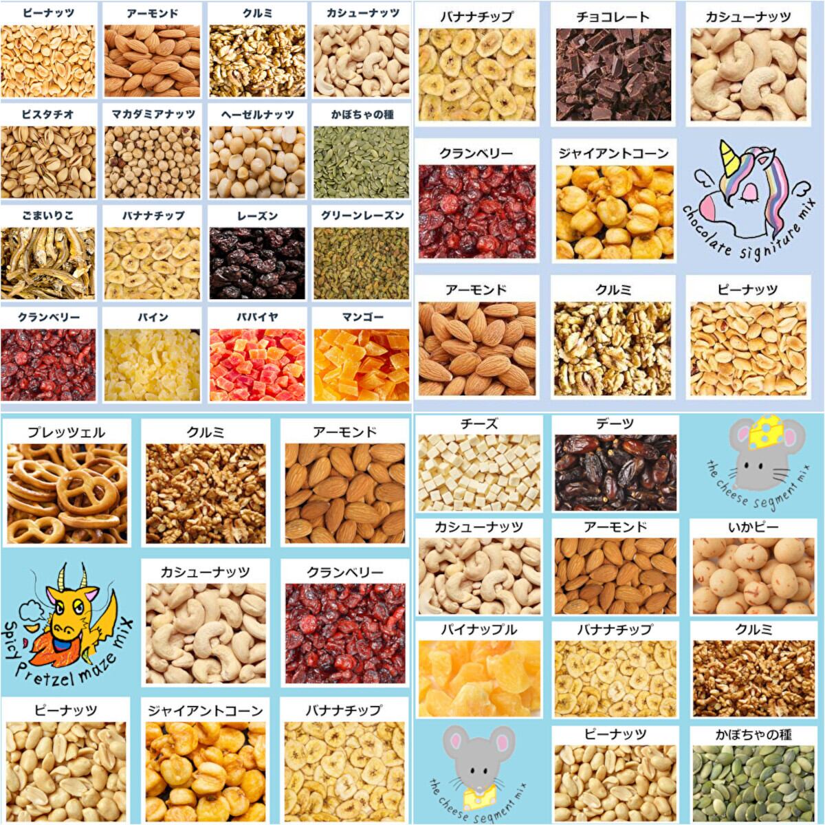 チップ・クランベリー・パイン・パパイア・マンゴー・レーズン・グリーンレーズン、チョコレート、ジャイアントコーン、プレッツェル、チーズ、デーツ、イカピー)