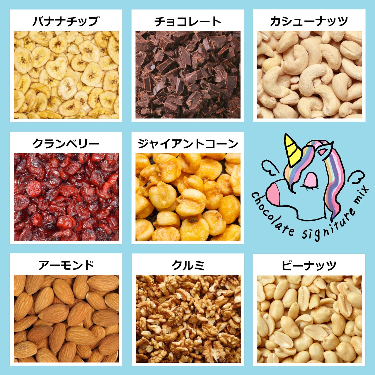 8種類のナッツ&フルーツ&チョコをオリジナルでMIXしました。