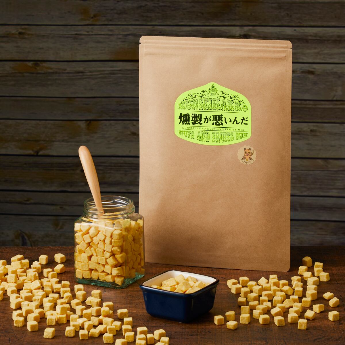 独自の燻製発酵法。秘密は、燻製+麹菌発酵!!大豆と米を麹菌発酵させた特殊パウダーを一粒一粒に薄くまとわせてから燻製をかけています。