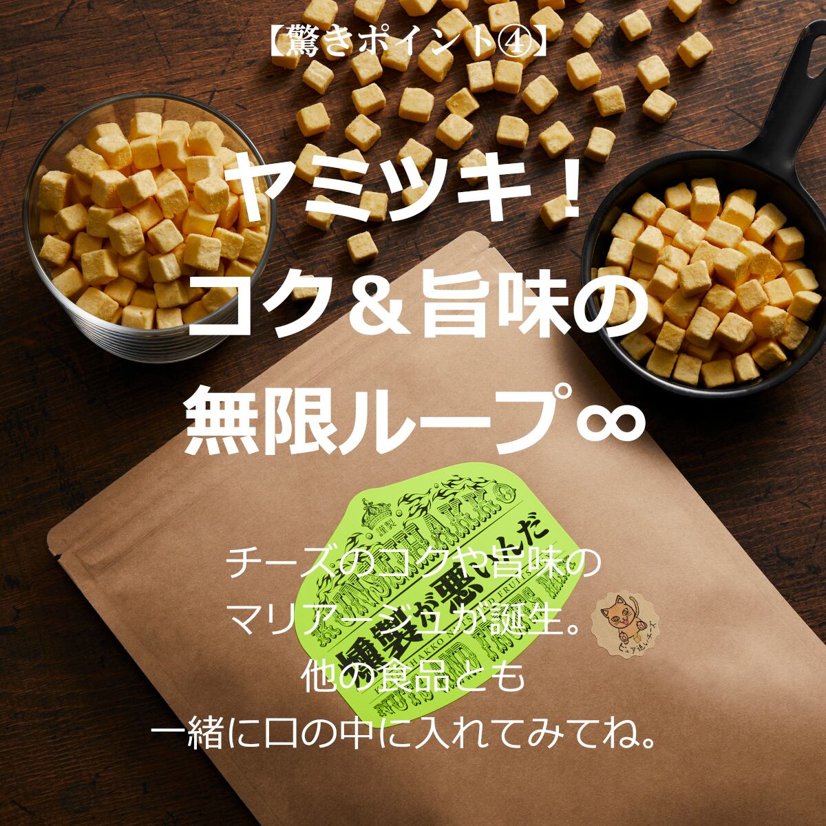 濃厚チェダーチーズを中心としたチーズMIXのコクと旨味のヤミツキ無限ループ!!